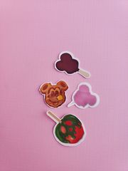 A 5 piece set of mini snack pack stickers. A pretzel, waffle, candied “poison” apple, cotton candy and an ice cream bar. All approximately 3/4” to 1” wide.