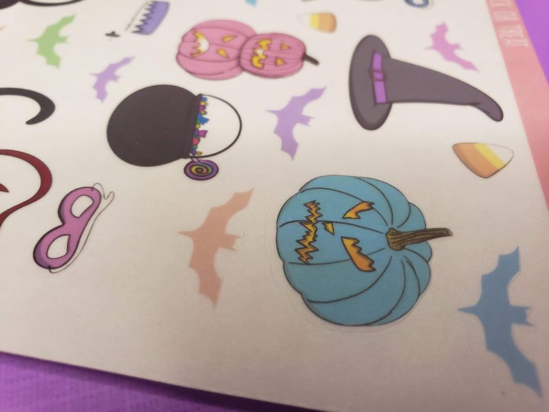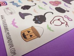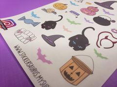 A collection of trick or treat themed stickers in vibrant pastel colors.